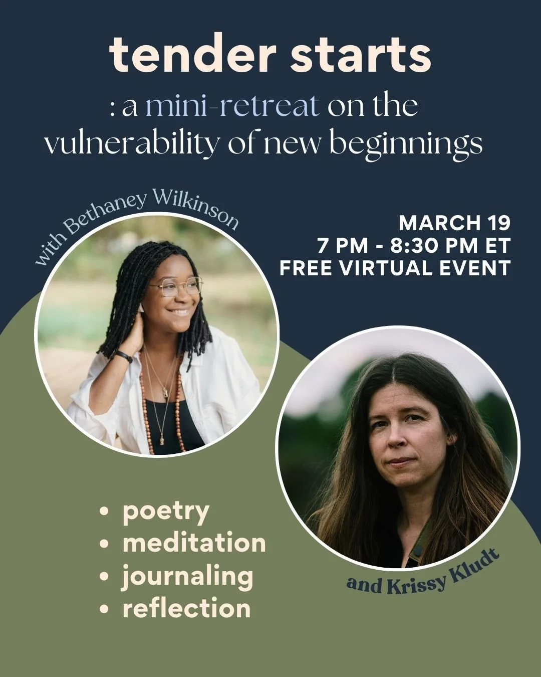 In this free mini-retreat guided by poet Krissy Kludt and writer Bethaney Wilkinson, we’ll reflect together on the tenderness of beginnings through poetry, meditation, journaling prompts and (optional) sharing. We’d love to step into this new season with you.