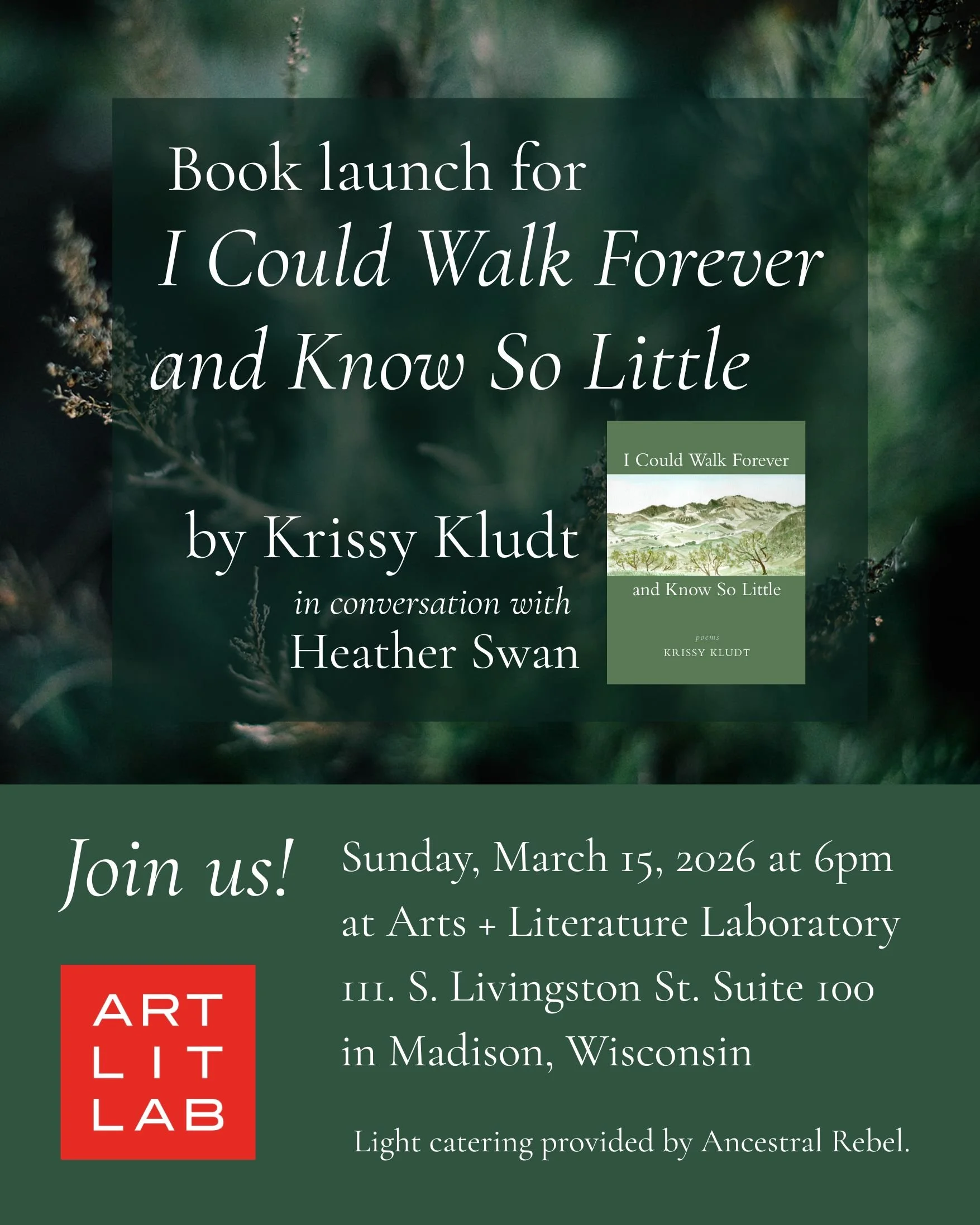 Join us in celebrating the launch of poet Krissy Kludt’s debut collection, I Could Walk Forever and Know So Little, in conversation with J. Drew Lanham, on Thursday, March 12, 2026 at 6:00pm CT.